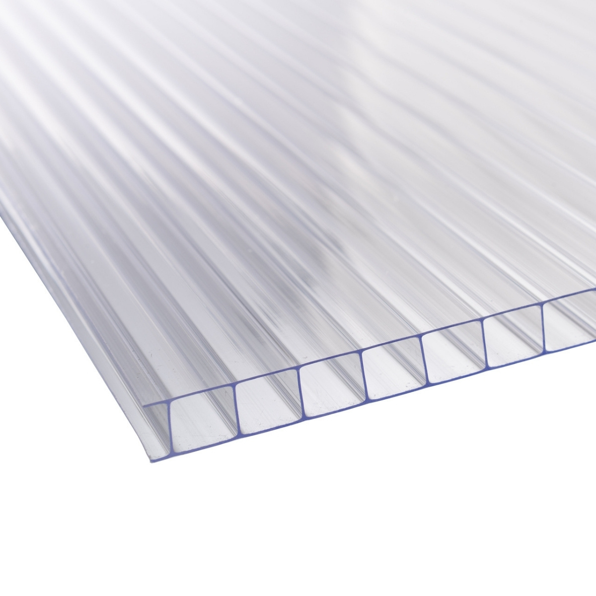 10x stronger than glass with no aging. Ideal for greenhouse glass, shed windows, or cost-effective applications. Its twinwall design diffuses light while allowing up to 85% through. Available in various widths and lengths.